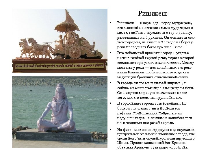 Ришикеш • • • Ришикеш — в переводе «город мудрецов» , основанный по легенде семью мудрецами в месте, где Ганга спускается с гор в долину, разветвляясь на 7 рукавов. Он считается святым городом, на закате и восходе на берегу реки проводится богослужение Ганге. Это небольшой красивый город в ущелье иссине-зелёной горной реки, берега которой соединяют три узких висячих моста. Между мостами у реки — песчаный пляж с огромными валунами, любимое место отдыха и медитации бродячих отшельников-садху. В городе много монастырей-ашрамов, и сейчас он считается мировым центром йоги. Он получил мировую известность после того, как его посетила группа Биттлз. В горах выше города есть водопады. По бурному течению Ганги проводится рафтинг, позволяющий попрыгать на надувной лодке по камням и полюбоваться нависающими над рекой горами. На фото: колесница Арджуны над спуском к центральной храмовой площадке города, где среди вод Ганги скульптура медитирующего Шивы. Правит колесницей бог Кришна, объясняя Арджуне суть мироустройства.