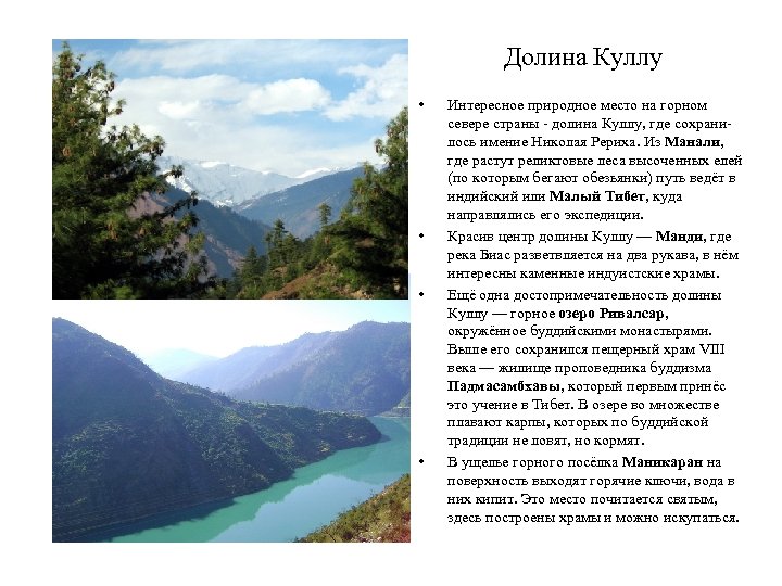 Долина Куллу • • Интересное природное место на горном севере страны - долина Куллу, где сохранилось имение Николая Рериха. Из Манали, где растут реликтовые леса высоченных елей (по которым бегают обезьянки) путь ведёт в индийский или Малый Тибет, куда направлялись его экспедиции. Красив центр долины Куллу — Манди, где река Биас разветвляется на два рукава, в нём интересны каменные индуистские храмы. Ещё одна достопримечательность долины Куллу — горное озеро Ривалсар, окружённое буддийскими монастырями. Выше его сохранился пещерный храм VIII века — жилище проповедника буддизма Падмасамбхавы, который первым принёс это учение в Тибет. В озере во множестве плавают карпы, которых по буддийской традиции не ловят, но кормят. В ущелье горного посёлка Маникаран на поверхность выходят горячие ключи, вода в них кипит. Это место почитается святым, здесь построены храмы и можно искупаться.