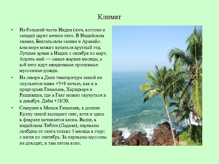 Климат • • • На большей части Индии (юге, востоке и западе) царит вечное лето. В Индийском океане, Бенгальском заливе и Аравийском море можно купаться круглый год. Лучшее время в Индии с октября по март. Апрель-май — самые жаркие месяцы, а всё лето идут ежедневные проливные муссонные дожди. На севере в Дели температура зимой не опускается ниже +5+8 ночью, как и в предгорьях Гималаев, Харидваре и Ришикеше, где в Ганг можно окунуться и в декабре. Днём +18/20. Севернее в Малых Гималаях, в долине Куллу зимой выпадает снег, хотя и здесь в феврале начинается весна. Выше, в индийском Тибете (Ладаке), перевалы свобдны от снега только 3 месяца в году: с июля по сентябрь. За перевалы муссоны не доходят, и там летом ясно.