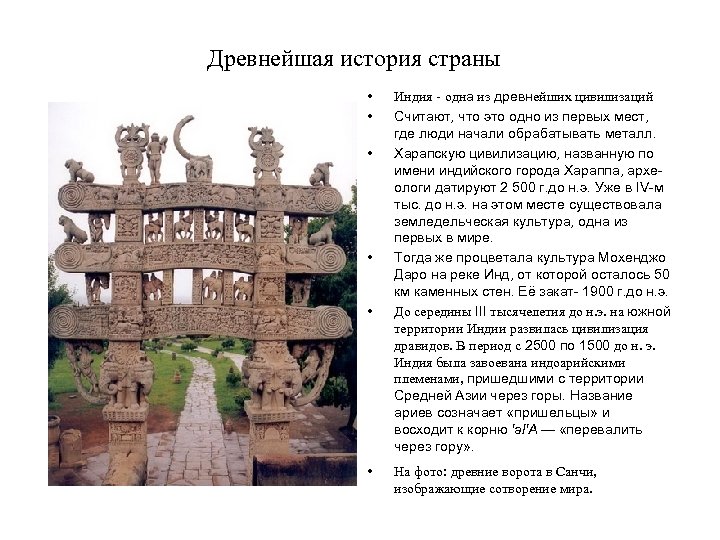 Древнейшая история страны • • • Индия - одна из древнейших цивилизаций Считают, что это одно из первых мест, где люди начали обрабатывать металл. Харапскую цивилизацию, названную по имени индийского города Хараппа, археологи датируют 2 500 г. до н. э. Уже в IV-м тыс. до н. э. на этом месте существовала земледельческая культура, одна из первых в мире. Тогда же процветала культура Мохенджо Даро на реке Инд, от которой осталось 50 км каменных стен. Её закат- 1900 г. до н. э. До середины III тысячелетия до н. э. на южной территории Индии развилась цивилизация дравидов. В период с 2500 по 1500 до н. э. Индия была завоевана индоарийскими племенами, пришедшими с территории Средней Азии через горы. Название ариев созначает «пришельцы» и восходит к корню 'al'A — «перевалить через гору» . На фото: древние ворота в Санчи, изображающие сотворение мира.