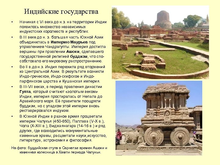 Индийские государства • • • Начиная с VI века до н. э. на территории Индии появилось множество независимых индуистских королевств и республик. В III веке до н. э. большая часть Южной Азии объединилась в Империю Маурьев под управлением Чандрагупты. Империя достигла вершины при правлении Ашоки, сделавшего государственной религией буддизм, что способстовало его мировому распространению. Во II в. до н. э. Индия пережила ряд вторжений из Центральной Азии. В результате возникли Индо-греческое, Индо-скифское и Индопарфянское царства и Кушанская империя. В III-VII веках, в период правления династии Гупта, который считают «золотым веком» Индии, империя простиралась от Непала до Аравийского моря. Её правители поощряли буддизм, но с упадком этой империи вновь реставрировался индуизм. В Южной Индии в разное время процветали империи Чалукья (450 -650), Паллава (V-X в. ), Чола (X-XIII в. ), Виджаянагара (14 -16 в. ) и ряд других, где возводились монументальные каменные храмы, расцветали науки, искусство, литература, астрономия и философия. На фото: буддийская ступа в Сарнатхе времен Ашоки и каменная колесница в Хампи периода Чалукьи.