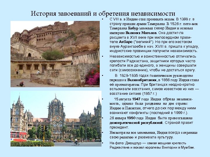 История завоеваний и обретения независимости • • С VIII в. в Индию стал проникать ислам. В 1398 г. в страну пришли армии Тамерлана. В 1526 г. пото-мок Тамерлана Бабур завоевал север Индии и основал империю Великих Моголов. Она достиг-ла расцвета в XVII веке при милосердном правителе Акбаре ("великий"). Но при его жестоком внуке Аурангазебе в нач. XVIII в. пришла к упадку, индуистские провинции получили независимость. Независимостью и воинственностью отличались крепости Раджастана, защитники которых часто погибали все до единого, а женщины совершали сати (самосожжение), чтобы не достаться врагу. В 1828 -1835 годах политическое руководство перешло к Великобритании, в 1856 году Индия стала её протекторатом. При британцах неодно-кратно вспыхивали восстания, самое известное из них — восстание сипаев (1857 г. ) 15 августа 1947 года Индия обрела независимость, однако была разделена на две страны: Индию и Пакистан, отчего до сих пор между ними возникают конфликты (последний в 1999 г. ). 26 января 1950 года Индия была провозглашена демократической республикой. Страной правит президент. Несмотря на все завоевания, Индия всегда сохраняла свою религию и развивала культуру. На фото: Джохдпур — самая мощная крепость Раджастана и вокзал королевы Виктории в Мумбае.