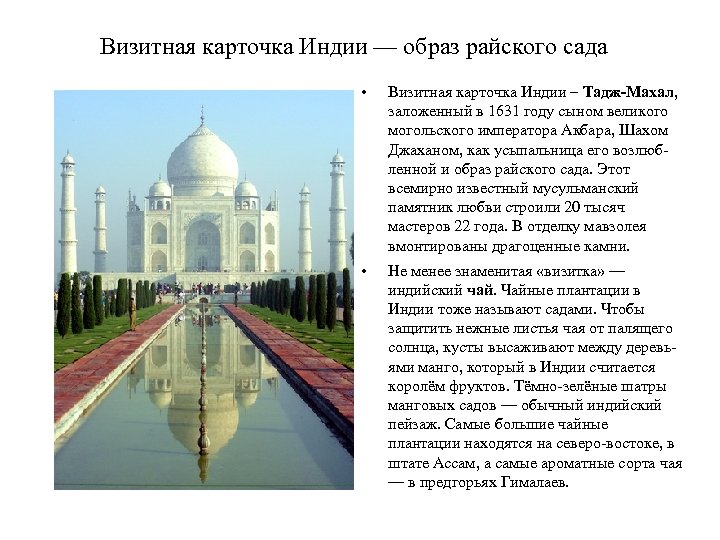 Визитная карточка Индии — образ райского сада • Визитная карточка Индии – Тадж-Махал, заложенный в 1631 году сыном великого могольского императора Акбара, Шахом Джаханом, как усыпальница его возлюбленной и образ райского сада. Этот всемирно известный мусульманский памятник любви строили 20 тысяч мастеров 22 года. В отделку мавзолея вмонтированы драгоценные камни. • Не менее знаменитая «визитка» — индийский чай. Чайные плантации в Индии тоже называют садами. Чтобы защитить нежные листья чая от палящего солнца, кусты высаживают между деревьями манго, который в Индии считается королём фруктов. Тёмно-зелёные шатры манговых садов — обычный индийский пейзаж. Самые большие чайные плантации находятся на северо-востоке, в штате Ассам, а самые ароматные сорта чая — в предгорьях Гималаев.