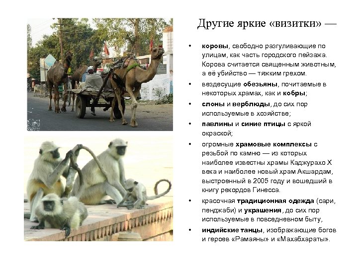 Другие яркие «визитки» — • коровы, свободно разгуливающие по улицам, как часть городского пейзажа. Корова считается священным животным, а её убийство — тяжким грехом. • вездесущие обезьяны, почитаемые в некоторых храмах, как и кобры; • слоны и верблюды, до сих пор используемые в хозяйстве; • павлины и синие птицы с яркой окраской; • огромные храмовые комплексы с резьбой по камню — из которых наиболее известны храмы Каджурахо X века и наиболее новый храм Акшардам, выстроенный в 2005 году и вошедший в книгу рекордов Гинесса. • красочная традиционная одежда (сари, пенджаби) и украшения, до сих пор используемые в повседневном быту, • индийские танцы, изображающие богов и героев «Рамаяны» и «Махабхараты» .
