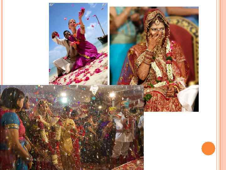 СВАДЕБНЫЙ ОБРЯД Правилом для индусов являются браки по выбору родителей. Согласно традиционным нормам индуистского брака, мужчина должен жениться в своей касте, хотя может жениться на женщине из подкасты более низкой, чем его собственная. Женщина же может быть выдана замуж в подкасту более высокую. В назначенный день жениха и невесту наряжают в свадебные одежды, надевают на них цветочные гирлянды и золотые украшения.