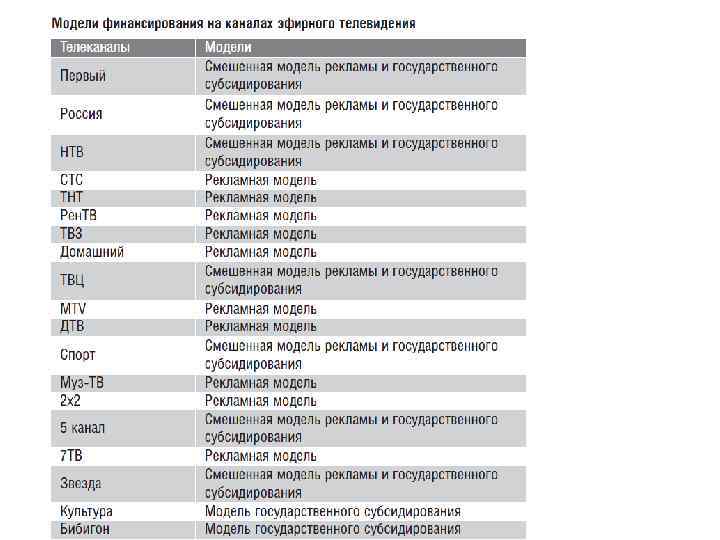 Источники финансирования К источникам финансирования телевидения относятся: собственные доходы (средства) субъектов отрасли (доходы от рекламы, подписки на платное телевидение, продажи контента и лицензий, оказания услуг по доставке сигнала, product placement и др. ); субсидии (как со стороны государства, так и со стороны собственников и партнёров); заёмные и привлечённые средства (кредиты, эмиссия ценных бумаг субъектов ТВ рынка (IPO) и др. ). Но на сегодняшний день финансовую основу дея тельности телевидения составляют три основных источника: доходы от рекламы, государственные субсидии и доходы от подписки на платные телевизионные услуги.