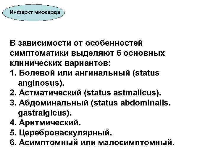 Инфаркт миокарда В зависимости от особенностей симптоматики выделяют 6 основных клинических вариантов: 1. Болевой или ангинальный (status anginosus). 2. Астматический (status astmalicus). 3. Абдоминальный (status abdominalis. gastralgicus). 4. Аритмический. 5. Цереброваскулярный. 6. Асимптомный или малосимптомный.