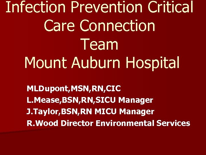 Infection Prevention Critical Care Connection Team Mount Auburn Hospital MLDupont, MSN, RN, CIC L. Mease, BSN, RN, SICU Manager J. Taylor, BSN, RN MICU Manager R. Wood Director Environmental Services