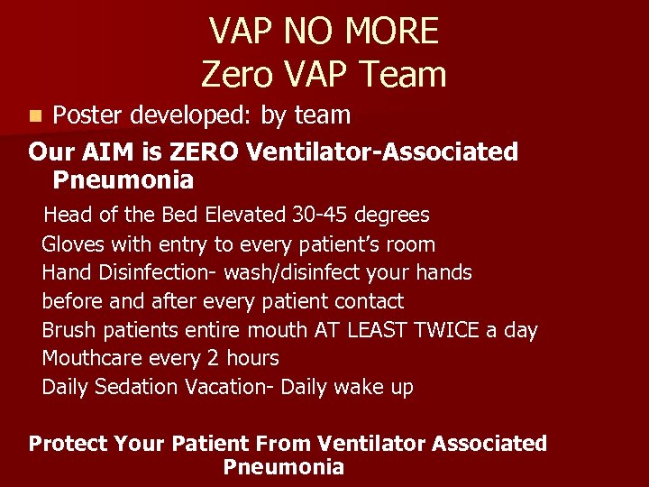 VAP NO MORE Zero VAP Team Poster developed: by team Our AIM is ZERO Ventilator-Associated Pneumonia n Head of the Bed Elevated 30 -45 degrees Gloves with entry to every patient’s room Hand Disinfection- wash/disinfect your hands before and after every patient contact Brush patients entire mouth AT LEAST TWICE a day Mouthcare every 2 hours Daily Sedation Vacation- Daily wake up Protect Your Patient From Ventilator Associated Pneumonia