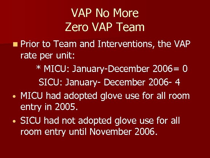 VAP No More Zero VAP Team n Prior to Team and Interventions, the VAP rate per unit: * MICU: January-December 2006= 0 SICU: January- December 2006 - 4 • MICU had adopted glove use for all room entry in 2005. • SICU had not adopted glove use for all room entry until November 2006.
