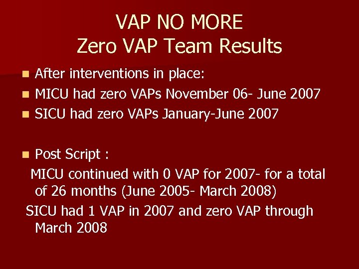 VAP NO MORE Zero VAP Team Results After interventions in place: n MICU had zero VAPs November 06 - June 2007 n SICU had zero VAPs January-June 2007 n Post Script : MICU continued with 0 VAP for 2007 - for a total of 26 months (June 2005 - March 2008) SICU had 1 VAP in 2007 and zero VAP through March 2008 n