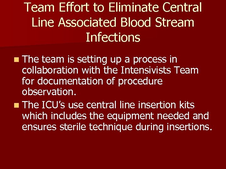 Team Effort to Eliminate Central Line Associated Blood Stream Infections n The team is setting up a process in collaboration with the Intensivists Team for documentation of procedure observation. n The ICU’s use central line insertion kits which includes the equipment needed and ensures sterile technique during insertions.