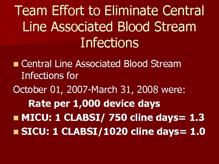 Team Effort to Eliminate Central Line Associated Blood Stream Infections n Central Line Associated Blood Stream Infections for October 01, 2007 -March 31, 2008 were: Rate per 1, 000 device days n MICU: 1 CLABSI/ 750 cline days= 1. 3 n SICU: 1 CLABSI/1020 cline days= 1. 0