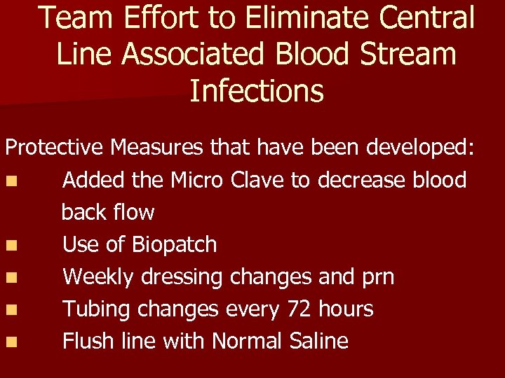 Team Effort to Eliminate Central Line Associated Blood Stream Infections Protective Measures that have been developed: n Added the Micro Clave to decrease blood back flow n Use of Biopatch n Weekly dressing changes and prn n Tubing changes every 72 hours n Flush line with Normal Saline