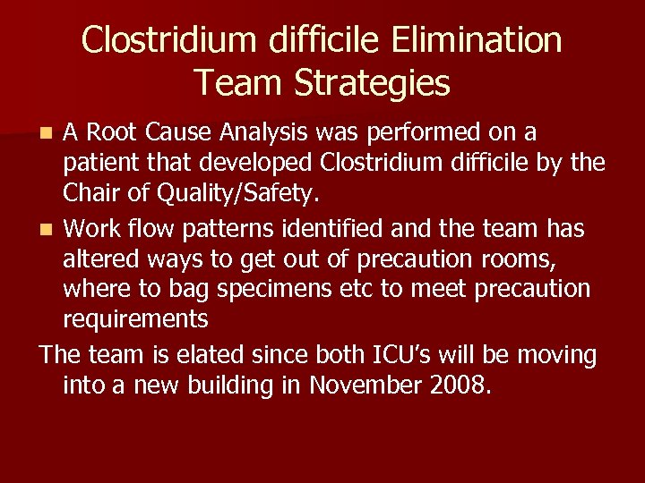 Clostridium difficile Elimination Team Strategies A Root Cause Analysis was performed on a patient that developed Clostridium difficile by the Chair of Quality/Safety. n Work flow patterns identified and the team has altered ways to get out of precaution rooms, where to bag specimens etc to meet precaution requirements The team is elated since both ICU’s will be moving into a new building in November 2008. n