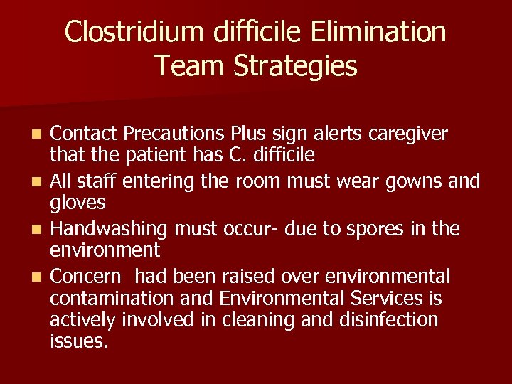 Clostridium difficile Elimination Team Strategies n As part of the team work on this issue, Environmental Services has developed specific disinfectant guidelines for Contact Precaution Plus rooms. n Education has been on-going both with clinical and environmental staff. n Environmental Services is part of the Team.