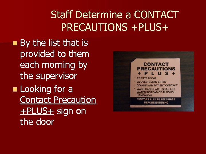 Staff Determine a CONTACT PRECAUTIONS +PLUS+ n By the list that is provided to them each morning by the supervisor n Looking for a Contact Precaution +PLUS+ sign on the door