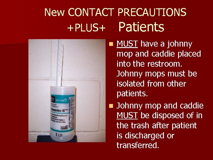 New CONTACT PRECAUTIONS +PLUS+ Patients MUST have a johnny mop and caddie placed into the restroom. Johnny mops must be isolated from other patients. n Johnny mop and caddie MUST be disposed of in the trash after patient is discharged or transferred. n