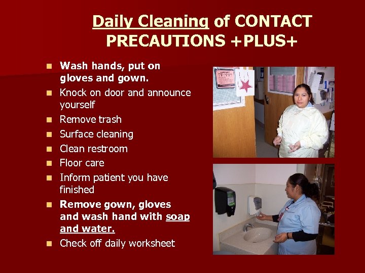 Daily Cleaning of CONTACT PRECAUTIONS +PLUS+ n n n n n Wash hands, put on gloves and gown. Knock on door and announce yourself Remove trash Surface cleaning Clean restroom Floor care Inform patient you have finished Remove gown, gloves and wash hand with soap and water. Check off daily worksheet