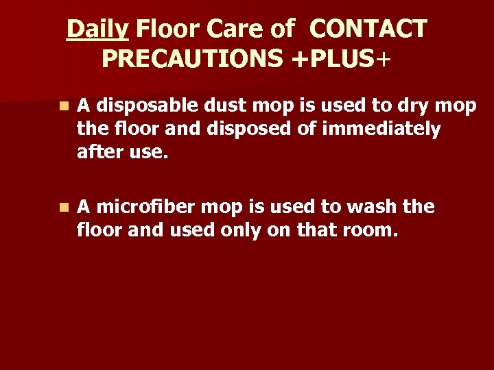 Daily Floor Care of CONTACT PRECAUTIONS +PLUS+ n A disposable dust mop is used to dry mop the floor and disposed of immediately after use. n A microfiber mop is used to wash the floor and used only on that room.