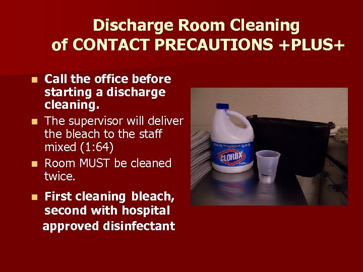 Discharge Room Cleaning of CONTACT PRECAUTIONS +PLUS+ Call the office before starting a discharge cleaning. n The supervisor will deliver the bleach to the staff mixed (1: 64) n Room MUST be cleaned twice. n n First cleaning bleach, second with hospital approved disinfectant
