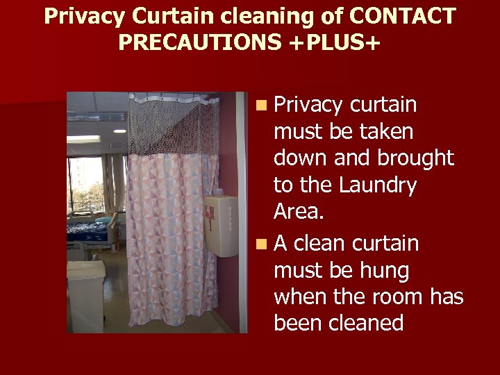 Privacy Curtain cleaning of CONTACT PRECAUTIONS +PLUS+ n Privacy curtain must be taken down and brought to the Laundry Area. n A clean curtain must be hung when the room has been cleaned