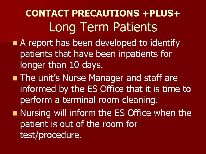 CONTACT PRECAUTIONS +PLUS+ Long Term Patients n. A report has been developed to identify patients that have been inpatients for longer than 10 days. n The unit’s Nurse Manager and staff are informed by the ES Office that it is time to perform a terminal room cleaning. n Nursing will inform the ES Office when the patient is out of the room for test/procedure.