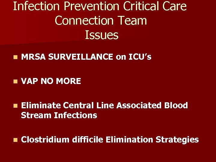 Infection Prevention Critical Care Connection Team Issues n MRSA SURVEILLANCE on ICU’s n VAP NO MORE n Eliminate Central Line Associated Blood Stream Infections n Clostridium difficile Elimination Strategies