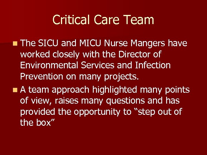 Critical Care Team n The SICU and MICU Nurse Mangers have worked closely with the Director of Environmental Services and Infection Prevention on many projects. n A team approach highlighted many points of view, raises many questions and has provided the opportunity to “step out of the box”