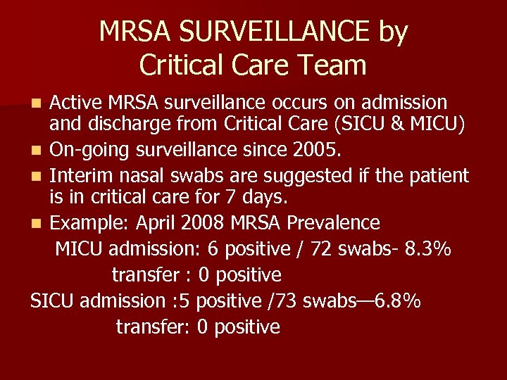 MRSA SURVEILLANCE by Critical Care Team Active MRSA surveillance occurs on admission and discharge from Critical Care (SICU & MICU) n On-going surveillance since 2005. n Interim nasal swabs are suggested if the patient is in critical care for 7 days. n Example: April 2008 MRSA Prevalence MICU admission: 6 positive / 72 swabs- 8. 3% transfer : 0 positive SICU admission : 5 positive /73 swabs— 6. 8% transfer: 0 positive n