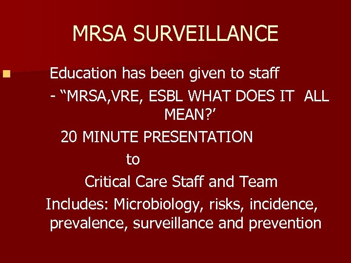 MRSA SURVEILLANCE n Education has been given to staff - “MRSA, VRE, ESBL WHAT DOES IT ALL MEAN? ’ 20 MINUTE PRESENTATION to Critical Care Staff and Team Includes: Microbiology, risks, incidence, prevalence, surveillance and prevention
