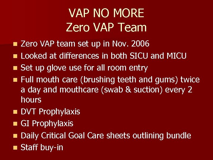 VAP NO MORE Zero VAP Team n n n n Zero VAP team set up in Nov. 2006 Looked at differences in both SICU and MICU Set up glove use for all room entry Full mouth care (brushing teeth and gums) twice a day and mouthcare (swab & suction) every 2 hours DVT Prophylaxis GI Prophylaxis Daily Critical Goal Care sheets outlining bundle Staff buy-in