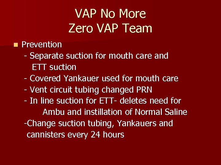 VAP No More Zero VAP Team n Prevention - Separate suction for mouth care and ETT suction - Covered Yankauer used for mouth care - Vent circuit tubing changed PRN - In line suction for ETT- deletes need for Ambu and instillation of Normal Saline -Change suction tubing, Yankauers and cannisters every 24 hours