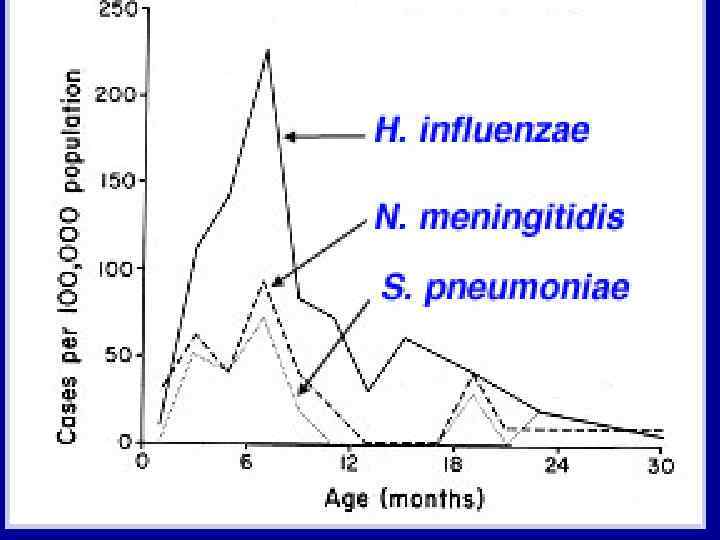 Etiology of meningitis in different age groups Age Causative agent 0 – 3 months Listeria monocytogenes, 3 – 36 months Neisseria meningitidis, Haemophilus influenzae, Streptococcus pneumoniae, Listeria monocytogenes, Group B streptococci, E. Coli and other Gram- bacteria Enterobacteriaceae, HSV-1, 2 Group B streptococci Older than 3 years Neisseria meningitidis, Haemophilus influenzae, Streptococcus pneumoniae, Enteroviruses