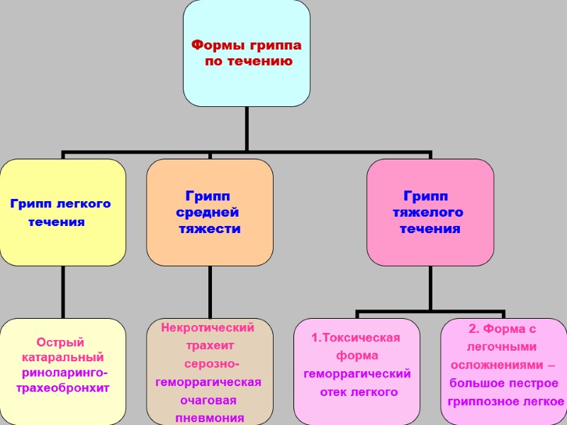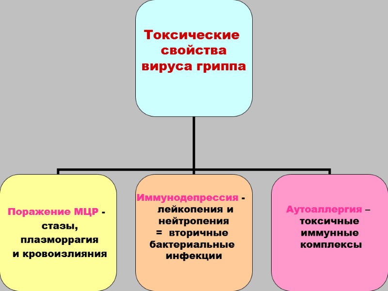 ПАТОГЕНЕЗ ГРИППА 1. воздушно-капельное заражение (ИП - 2-4 дня) 2. входные ворота - эпителиоциты слизистой носа, трахеи, альвеолы 3. внедрение ВГ в эпителиоциты, репродукция, цитолиз клеток, освобождение новых вирусных частиц 4. дальнейшее поражение эпителиоцитов – дистрофия, некроз и десквамация эпителия слизистых 5. повреждение соединительной ткани, деструкция сосудов МЦР 6. вирусемия 7. токсинемия и общетоксические проявления : дистрофия паренхиматозных органов, сосудистые нарушения в ЦНС, присоединение вторичных бактериальных инфекций 8. иммунитет - элиминация вируса и токсинов и формирование клеток памяти