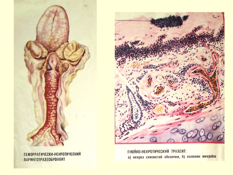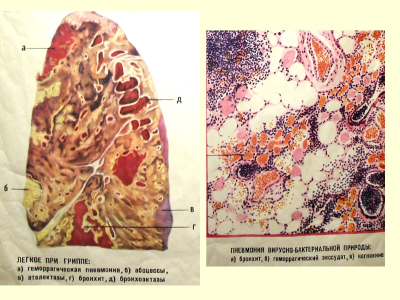 Грипп: очаговая геморрагическая пневмония, некротический трахеобронхит