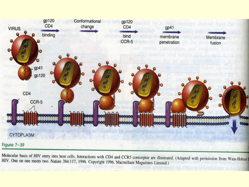 ВИЧ-1 и ВИЧ-2 Продолжительность болезни, вызываемой ВИЧ-1, составляет 10-12 лет, а ВИЧ-2 - 20-25 лет РНК–содержащий вирус, Т- лимфотропный ретровирус высокая генетическая и антигенная изменчивость - т «ускользание» вируса от иммунного ответа, ограничение разработки вакцин Входные ворота -слизистая половых органов, прямой кишки, места инъекций, попадание в кровь Белок gр120 - «прикрепление» к клетке-мишени, несущей CD4–антиген - Т- хелперы, макрофаги, моноциты,клетки Лангерганса, тимоциты, эозинофилы, нейроны, глиоциты мозга и др. Белок gр41 («белок слияния»)- слияние оболочки вируса с мембраной клетки и проникновение его в клетку-мишень - образование многоклеточных симпластов из Т-хелперных лимфоцитов
