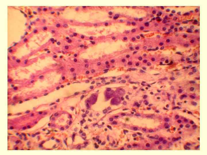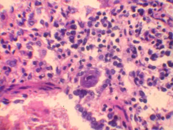 • Патогенез 1. проникновения в эпителиоцит, репродукция вируса, образование внутриядерных вирусных частиц 2. цитолиз, освобождение частиц вируса, инфицирование других клеток 3. проникновение в регионарные лимфатические узлы - лимфаденит 4. поражение конъюнктивы глаза с формированием нежной фибринозной пленки - пленчатый конъюнктивит 5. нисходящее поражение мелких бронхов = некротический бронхит 6. интерстициальные пневмонии- гигантоклеточная трансформация в дыхательных путях, гигантоклеточная десквамативная пневмония 7. вторичные бактериальные инфекции 8. вирусемия, поражение различных органов (вирус - в печени и селезенке), мезаденит и медиастинит, ЖКТ, поражение почек.