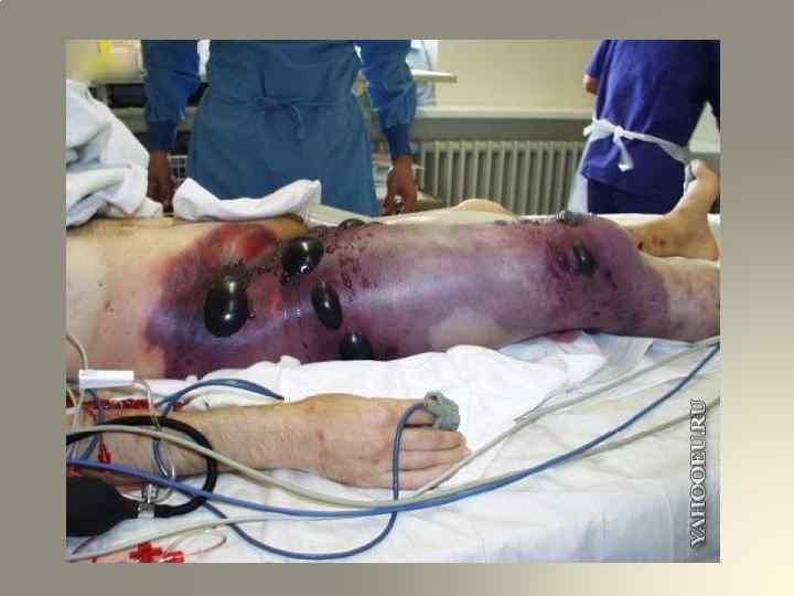 3. Изменения в ране. Сухость, большое количество раневого отделяемого кровянистого характера ( «лаковая кровь» ). Мышцы имеют серую окраску, напоминают по виду варѐное мясо. В результате развивающегося отѐка и импрегнации тканей газом мышечная ткань пролабирует из раневого отверстия. Нередко на коже поражѐнного сегмента образуются характерные пузыри, заполненные либо кровянистой, либо прозрачной, либо мутной жидкостью. Кожа приобретает «бронзовую» , «шафранную» , коричневую или голубую окраску. Это обусловлено диапедезом эритроцитов, которые быстро разрушаются под действием ферментов, выделяемых микроорганизмами; гемоглобин распадается с образованием грязно-бурого пигмента, который придаѐт тканям специфическую окраску. Нередко раны с развившейся анаэробной инфекцией издают неприятный гнилостный запах, напоминающий запах мышей, «прелого сена» , «кислой капусты» .