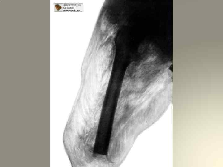 5. Отсутствие чувствительности и двигательной функции в дистальных отделах конечности – ранний и грозный симптом развития анаэробной инфекции. Эти нарушения появляются даже при внешне малых изменениях со стороны раны и конечности, являются очень важными: они помогают выявить анаэробную инфекцию, когда, на первый взгляд, других симптомов ещѐ нет. Поэтому врачам приѐмно-сортировочных отделений следует всегда иметь иглу для определения чувствительности дистальных отделов конечностей и пальцев. 6. Рентгенологическое исследование – вспомогательный метод определения газа в тканях. При распространении газа по мышечной ткани на рентгенограмме отмечаются «перистые облака» или «ѐлочки» , а при наличии газа в подкожной клетчатке изображение напоминает «пчелиные соты»