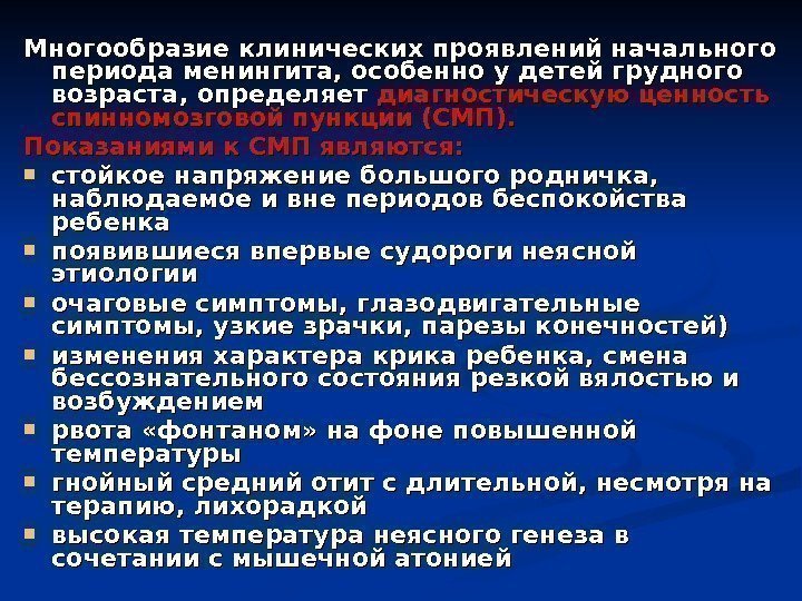 Многообразие клинических проявлений начального периода менингита, особенно у детей грудного возраста, определяет диагностическую ценность спинномозговой пункции (СМП). Показаниями к СМП являются: стойкое напряжение большого родничка, наблюдаемое и вне периодов беспокойства ребенка появившиеся впервые судороги неясной этиологии очаговые симптомы, глазодвигательные симптомы, узкие зрачки, парезы конечностей) изменения характера крика ребенка, смена бессознательного состояния резкой вялостью и возбуждением рвота «фонтаном» на фоне повышенной температуры гнойный средний отит с длительной, несмотря на терапию, лихорадкой высокая температура неясного генеза в сочетании с мышечной атонией