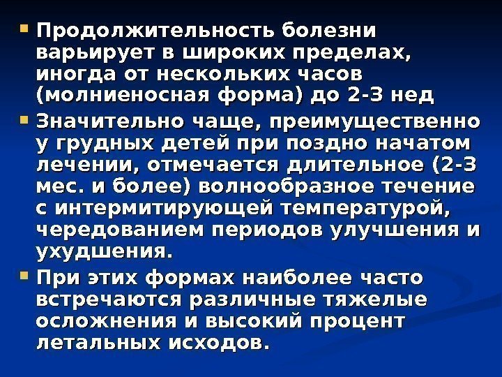 Продолжительность болезни варьирует в широких пределах, иногда от нескольких часов (молниеносная форма) до 2 -З нед Значительно чаще, преимущественно у грудных детей при поздно начатом лечении, отмечается длительное (2 -З мес. и более) волнообразное течение с интермитирующей температурой, чередованием периодов улучшения и ухудшения. При этих формах наиболее часто встречаются различные тяжелые осложнения и высокий процент летальных исходов.