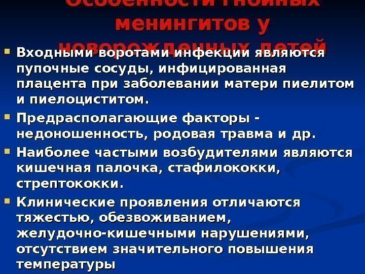 Особенности гнойных менингитов у новорожденных детей Входными воротами инфекции являются пупочные сосуды, инфицированная плацента при заболевании матери пиелитом и пиелоциститом. Предрасполагающие факторы — недоношенность, родовая травма и др. Наиболее частыми возбудителями являются кишечная палочка, стафилококки, стрептококки. Клинические проявления отличаются тяжестью, обезвоживанием, желудочно-кишечными нарушениями, отсутствием значительного повышения температуры