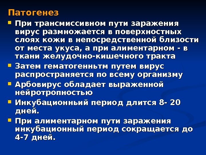 Патогенез При трансмиссивном пути заражения вирус размножается в поверхностных слоях кожи в непосредственной близости от места укуса, а при алиментарном — в ткани желудочно-кишечного тракта Затем гематогенньтм путем вирус распространяется по всему организму Арбовирус обладает выраженной нейротропностью Инкубационньий период длится 8 — 20 дней. При алиментарном пути заражения инкубационный период сокращается до 4 -7 дней.