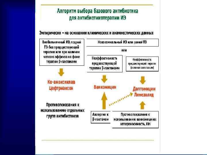 Оптимальная химиотерапия бактериемий, включая ИЭ • Нарастающая роль MRSA и высокий уровень летальности у б-х с бактериемией при неадекватной терапии говорят о необходимости стартовой эмпирической АБтерапии, действующей как на MSSA, так и на MRSA и полирезистент. грам+ кокки. • Сегодня оптимальным химиотерапевтическим режимом тяжёлой грамположительной инфекции является новый АБ - даптомицин (Кубицин). • • Новые риск- ф-ры, кроме в/в наркотиков, пожилой возраст, искусств. клапаны, иммуносупрессия, водители ритма.