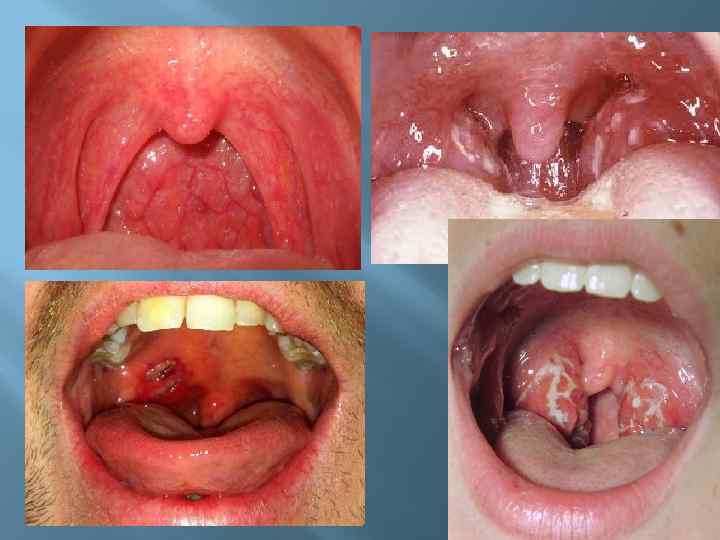 К стоматологу пациенты обращаются с жалобами на боли и першение в горле, осиплость голоса, болезненность приеме пищи, глотании, наличие резко отечных десен и мелких (0, 2 -0, 4 см) или обширных (1, 3 -1, 8 см) эрозийных элементов на слизистой оболочке щечных областей, переходных складок, мягкого и твердого неба, боковых поверхностей языка, нарушение общего состояния. Эрозии множественные, с полигональными краями без фибринозного налета, по краю языка - отпечатки зубов, движения языка не ограничены, мацерация углов рта, густая, вязкая слюна, однако, на резко отечных и гиперемированных деснах отсутствовал симптом кровоточивости, а эрозии были слабоболезненными. Несмотря на наличие множественных эрозий на СОПР, пациенты больше жалоб предъявляли к области воспаленных миндалин и глотки, где отмечались различные формы ангины (катаральная, лакунарная, фолликулярная, язвенно-некротическая с переходом на заднюю стенку глотки). Кроме поражения миндалин, на задней стенке глотки определялись папулы синюшно-красного цвета, грязно -серый налет на спинке языка, снимающийся при поскабливании с обнажением эрозийной поверхности.