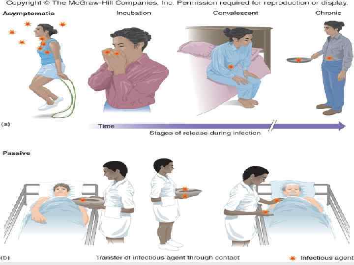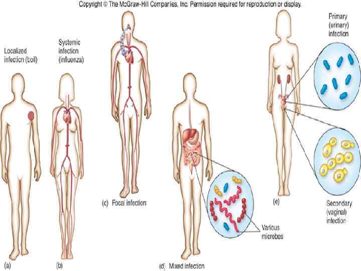 В зависимости от остроты течения и продолжительности пребывания микроорганизма в организме • Острая инфекция – острое внезапное начало, • • • непродолжительное течение (чума, холера) Хроническая инфекция – длительное пребывание микроорганизмов в организме, иногда годами Бессимптомная (латентная, инапарантная) инфекция – протекает без выраженных симптомов (первичный туберкулез у детей – кальцинаты, герпетическая инфекция) Манифестная инфекция – протекает при наличии характерного симптомокомплекса Медленная (персистирующая) инфекция (от «persistence» – постоянство, продолжительность) – прогредиентное течение с нарастанием симптоматики (ВИЧ) Микробоносительство (бактерионосительство, вирусоносительство) – состояние, при котором выделение возбудителя продолжается после клинического выздоровления больного