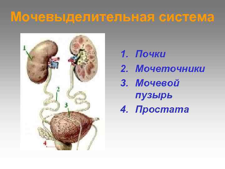Мочевыделительная система 1. Почки 2. Мочеточники 3. Мочевой пузырь 4. Простата