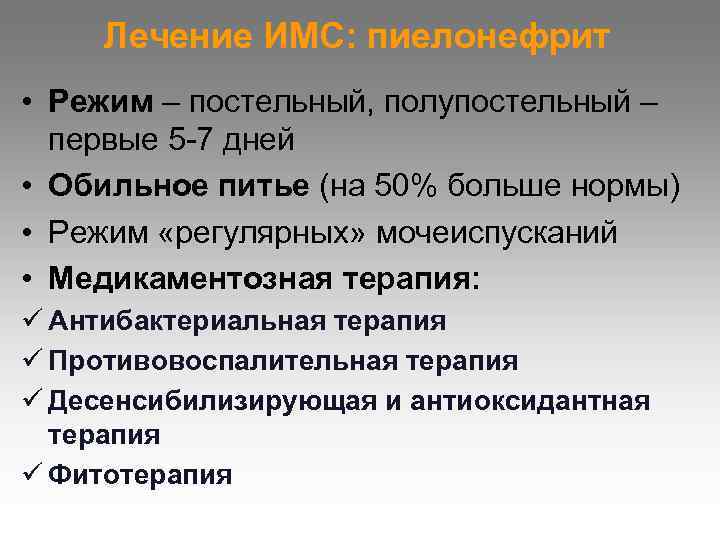 Лечение ИМС: пиелонефрит • Режим – постельный, полупостельный – первые 5 -7 дней • Обильное питье (на 50% больше нормы) • Режим «регулярных» мочеиспусканий • Медикаментозная терапия: ü Антибактериальная терапия ü Противовоспалительная терапия ü Десенсибилизирующая и антиоксидантная терапия ü Фитотерапия