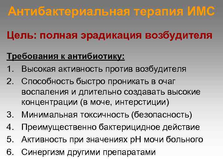 Антибактериальная терапия ИМС Цель: полная эрадикация возбудителя Требования к антибиотику: 1. Высокая активность против возбудителя 2. Способность быстро проникать в очаг воспаления и длительно создавать высокие концентрации (в моче, интерстиции) 3. Минимальная токсичность (безопасность) 4. Преимущественно бактерицидное действие 5. Активность при значениях р. Н мочи больного 6. Синергизм другими препаратами